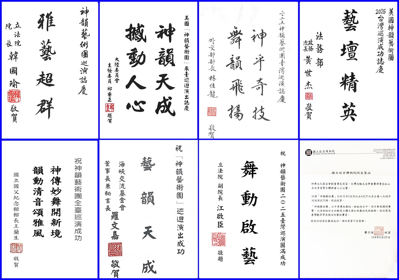 美国神韵艺术团第十七度莅临台湾前夕,包括中华民国立法院长韩国瑜、外交部长林佳龙等一百零九位中央政府官员及地方政府政要纷纷致赠贺词,迎接神韵再度来台演出。