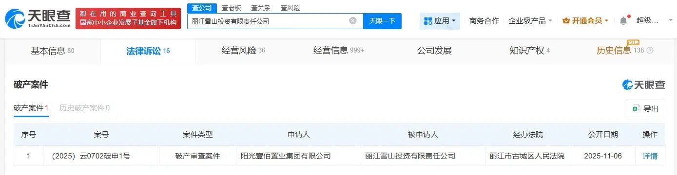 天眼查天眼风险信息显示,11月6日,丽江雪山投资有限责任公司新增1则破产审查案件,申请人为阳光壹佰置业集团有限公司,经办法院为丽江市古城区人民法院。