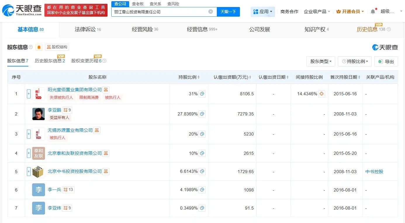 丽江雪山投资有限责任公司成立于2008年11月,法定代表人为李国栋,注册资本约2.6亿人民币,经营范围包括房地产开发、文化产业投资等。股东信息显示,该公司由阳光壹佰置业集团有限公司、李亚鹏等共同持股。其中,李亚鹏持股约27.8%,阳光壹佰置业集团有限公司持股31%。
