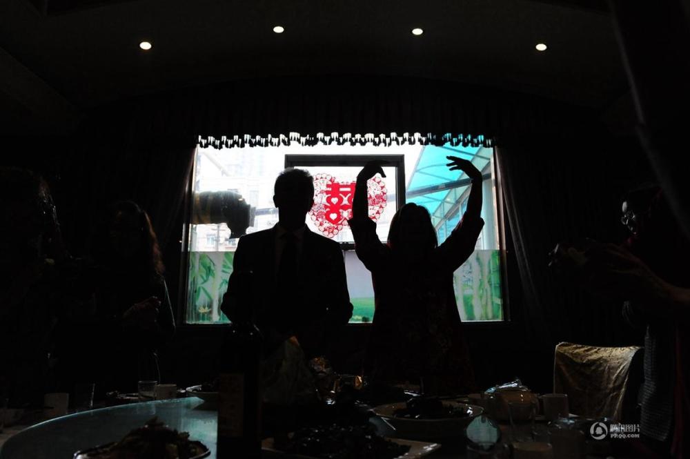 二人坐在主人的位置上,挥舞着手臂,示意大家举杯。现场,仍是一片安静。